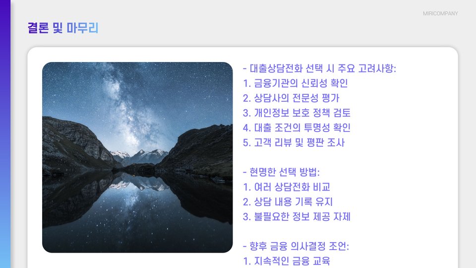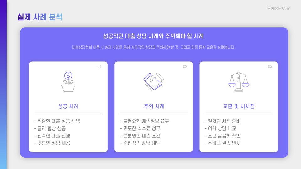 마지막으로, 대출 상담전화는 특정한 대출 상품이나 금융 기관에 국한되지 않고, 다양한 옵션을 제시하여 고객이 선택할 수 있도록 해야 합니다. 즉, 여러 금융 기관의 대출 상품에 대한 정보를 제공하며, 가장 유리한 조건을 비교할 수 있는 환경을 조성하는 것이 중요합니다.