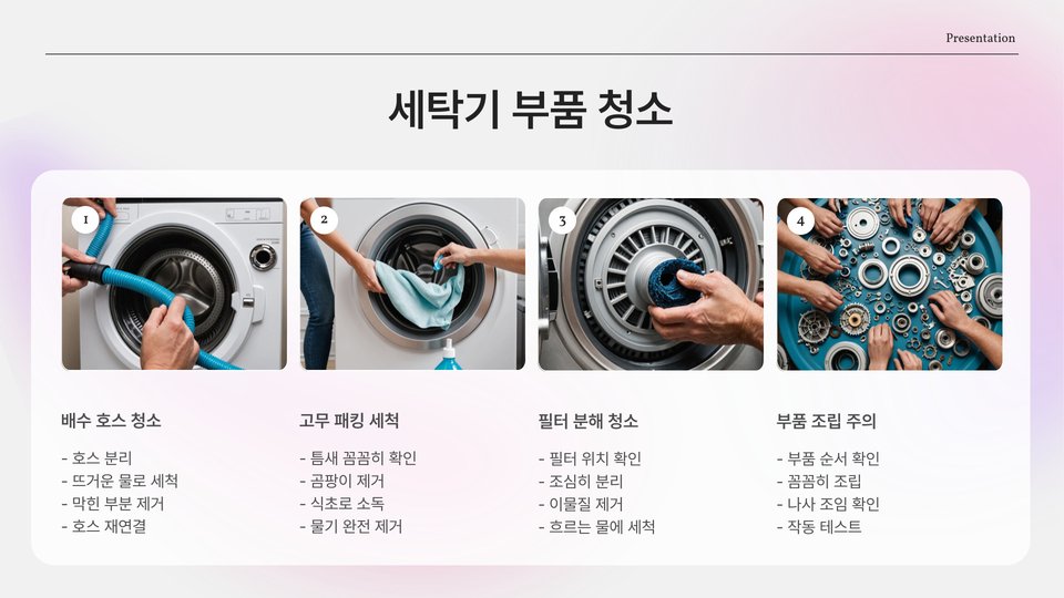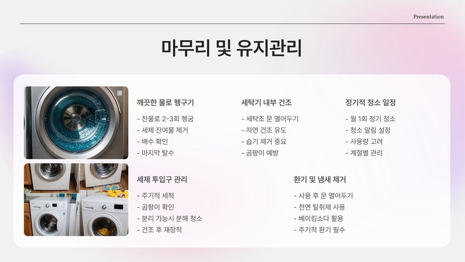 이와 같은 단계별 점검으로 세탁기는 항상 최상의 상태를 유지할 수 있습니다. 나중에 발생할 수 있는 문제들을 미리 방지하고, 오랫동안 나의 세탁기와 함께하는 데 큰 도움이 될 것입니다.