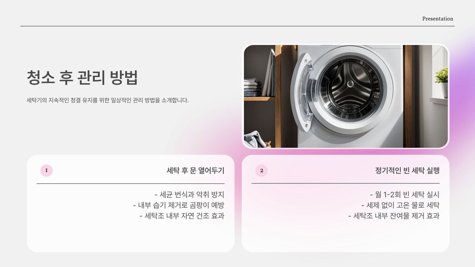 이 가이드를 참고하여 통돌이 세탁기를 정기적으로 청소해보세요. 세탁기의 성능과 위생을 동시에 챙길 수 있는 좋은 방법입니다. 깨끗한 세탁기가 여러분의 생활을 더욱 편리하게 만들어줄 것입니다.