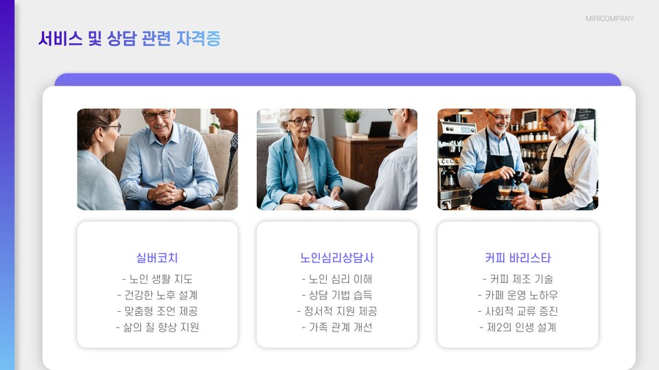 - 60대에 적합한 자격증: 사회복지사, 요양보호사, 커피 바리스타