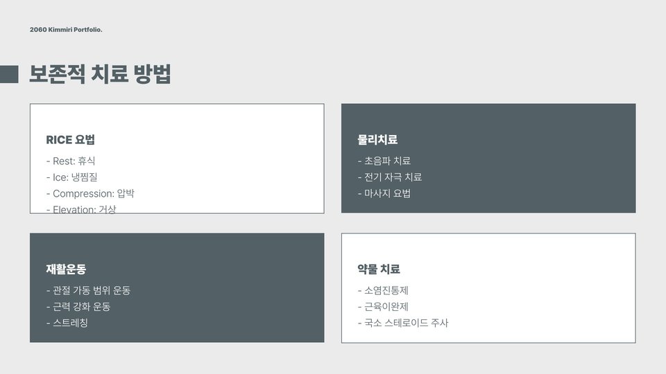 - 비수술적 치료는 통증 완화와 적극적인 재활 운동이 포함됩니다.